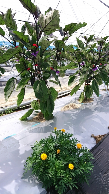 ナスとマリーゴールドを混植することで、ナスの実を加害する「ミナミキイロアザミウマ」の防除ができます。